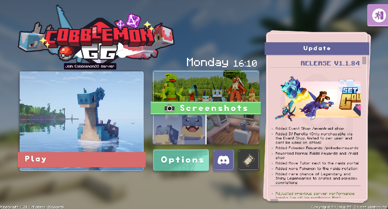 Instead of manually adding mods, you can install our entire optimized setup with one click and then click play. Search for cobblemon.gg and click the one by hihihih565.